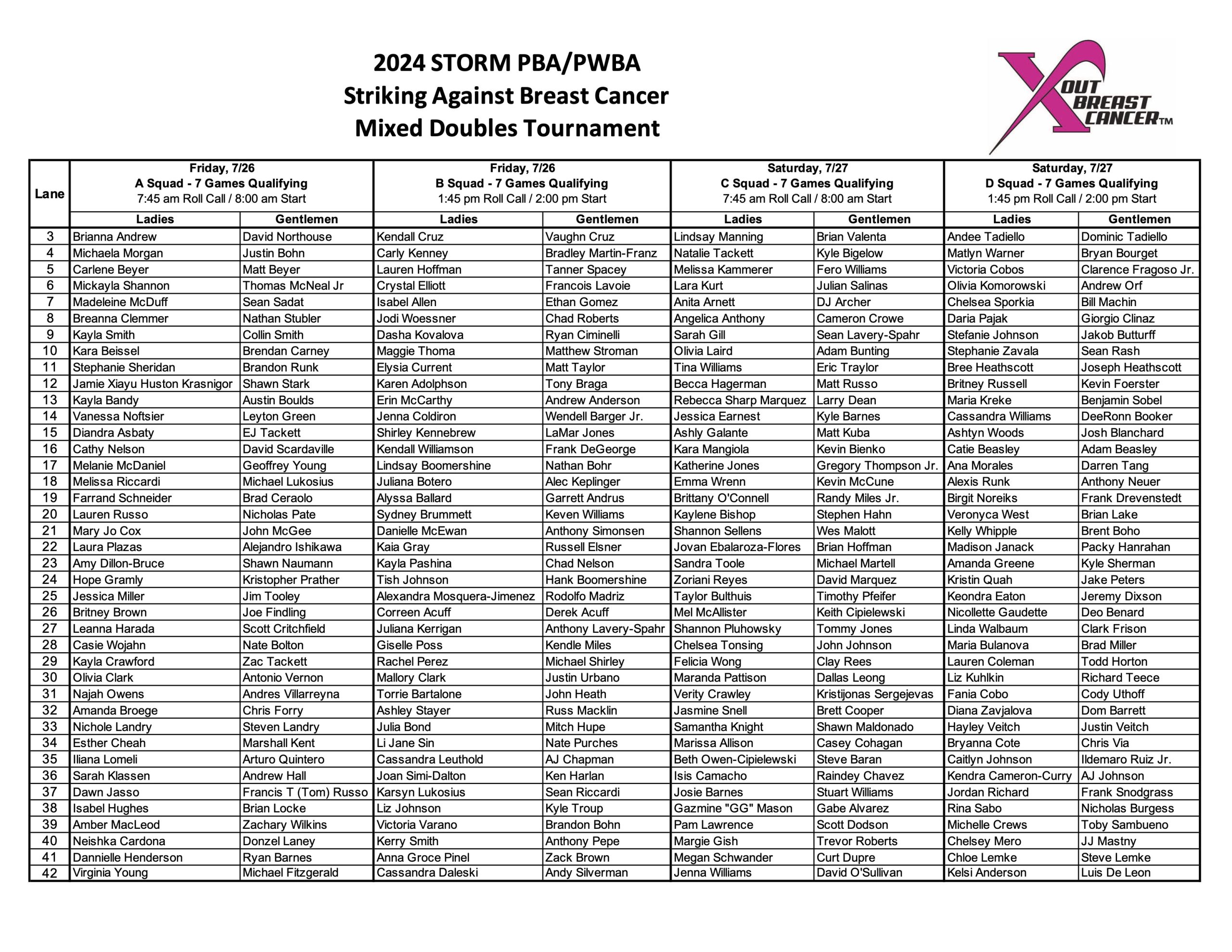 The Storm PBA/PWBA Striking Against Breast Cancer Mixed Doubles Tournament will be the first of three remaining title events this season, followed by the PBA/PBA50/PWBA Jonesboro Trios next week and the Storm Lucky Larsen Masters at the end of August.